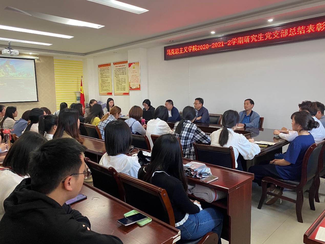 5月18日下午,必赢官网研究生党支部2020-2021-2学期总结表彰大会在社科楼323会议室举办。唐国战书记、黄世明副院长、何晓坚副书记和全体研究生参加了此次会议,会议由支部书记郑晨霞老师主持。