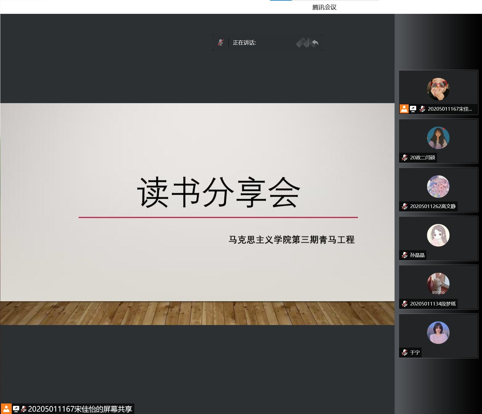 4月30日晚,必赢76net线路官网第三期优秀“青马”工程学员们通过腾讯会议开展了读书分享会活动。活动由班长宋佳怡主持。