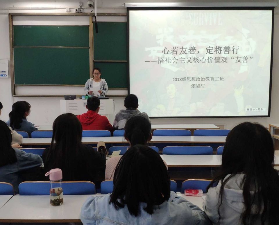 4月10日下午,必赢官网优秀“青马”工程学员张甜甜参加了2018级第二团支部于社科楼516教室开展的讲价值观故事活,并籍此进行宣讲。必赢官网实践部、新闻部、心理健康部相关负责人和2018级各班班委共同参与本次活动。