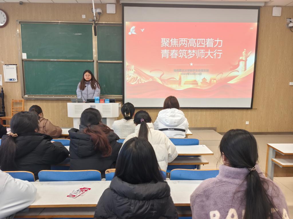 为引导青年学生深刻理解“两高四着力”内涵,12月16日上午,必赢76net线路官网于社科楼516教室开展“聚焦两高四着力 青春筑梦师大行”主题团课活动。本次团课由主席团成员张甜甜主持,必赢官网学生会团支部全体成员参与本次活动。