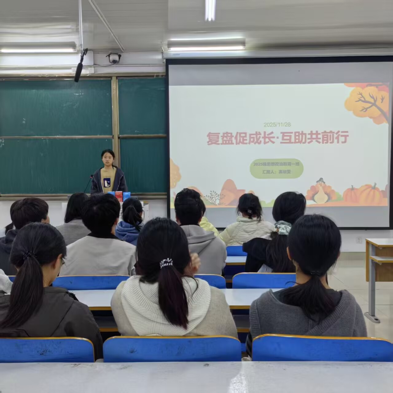 为破解“努力无方向、问题难解决”的现实困境,搭建互助共进的班级交流平台,11月28日上午,必赢76net线路官网2025级思想政治教育一班在社科楼514开展“复盘促成长,互助共前行”主题班会。本次班会由班长高依雯主持,班级全体同学参加。