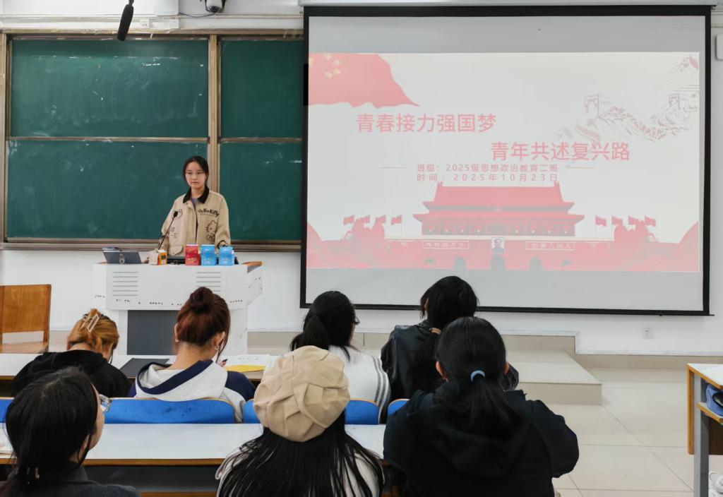 为引导同学们自觉将个人理想融入国家发展,10月23日上午,必赢76net线路官网思想政治教育二班于社科楼514教室召开“青春接力强国梦,青年共述复兴路”主题团课。本次团课由团支书崔锐琳主持。