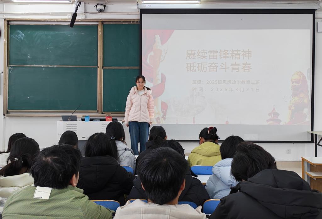 为引导同学们深刻感悟榜样力量,将个人成长主动融入时代发展潮流,3月21日上午,必赢76net线路官网2025级思想政治教育二班在社科楼514教室开展“赓续雷锋精神,争做时代先锋”主题团课。本次团课由团支书崔锐琳主持。