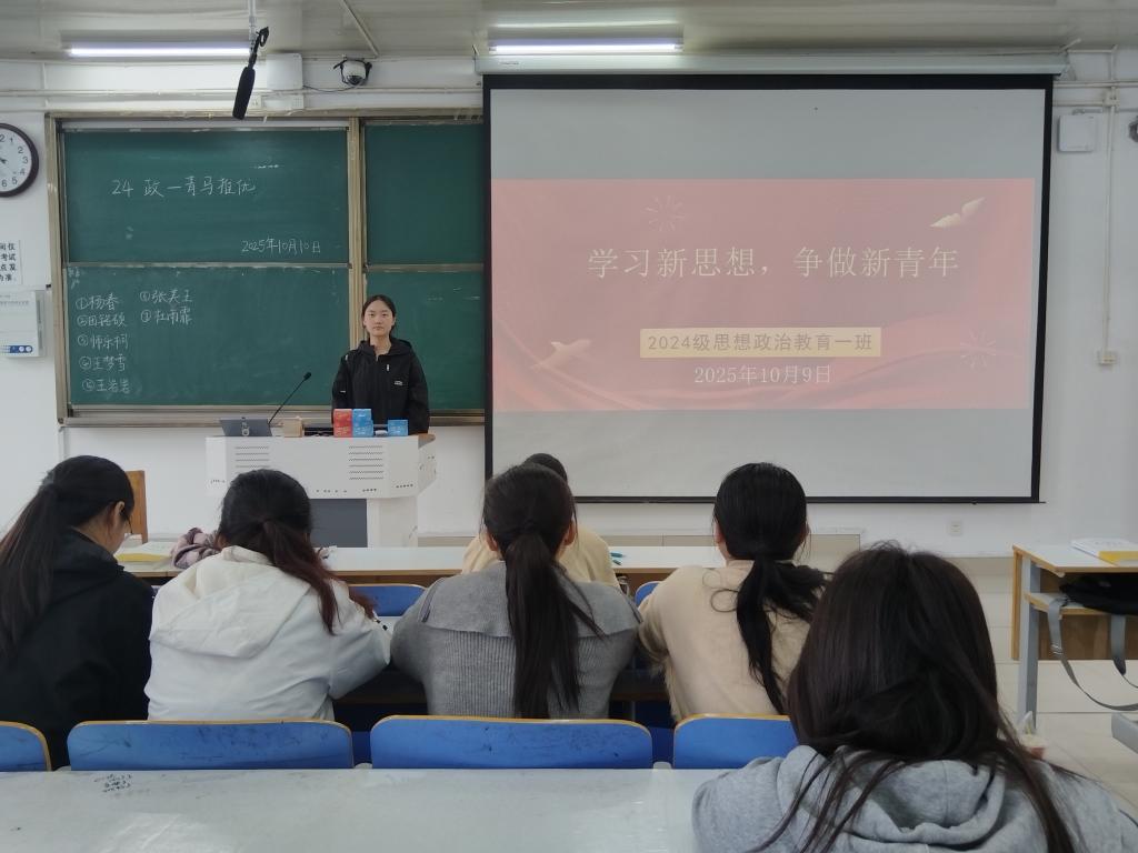 为激励我班同学深入学习和贯彻习近平新时代中国特色社会主义思想,将党的智慧结晶同个人发展实际相结合,以实际行动实现人生理想和民族复兴,10月9日上午,必赢76net线路官网思想政治教育一班于社科楼515教室开展“学习新思想,争做新青年”主题团课。本次团课由团支书李冉主持,一班全体同学参加。