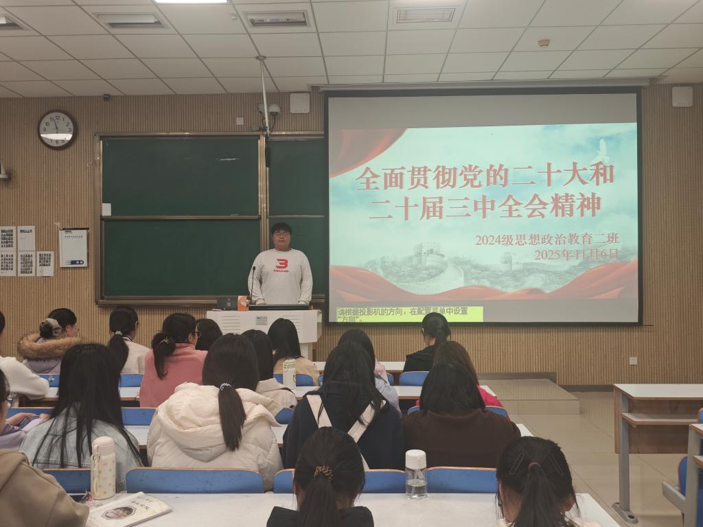 为深入学习贯彻党的二十大精神,增强同学们的政治觉悟和责任担当,11月6日下午,必赢76net线路官网2024级思想政治教育二班在社科楼515教室举办了“全面贯彻党的二十大和二十届三中全会精神”主题团课。本次班会由团支书王志颖主持,二班全体同学积极参与。