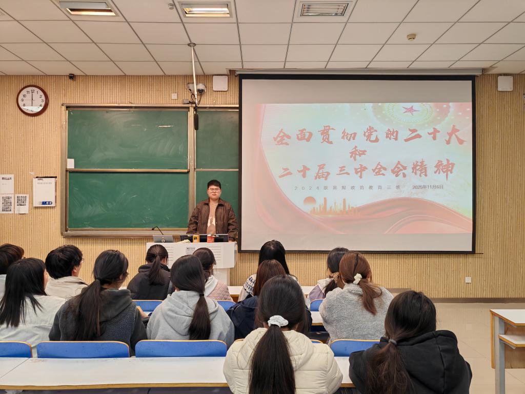 为深入学习贯彻党的二十大和二十届三中全会精神,引导青年学子将思想和行动统一到党中央决策部署上来,必赢76net线路官网2024级思想政治教育三班于11月6日在社科楼515教室召开“全面贯彻党的二十大和二十届三中全会精神”主题团课活动。此次团课由团支书杨迎滨主持。
