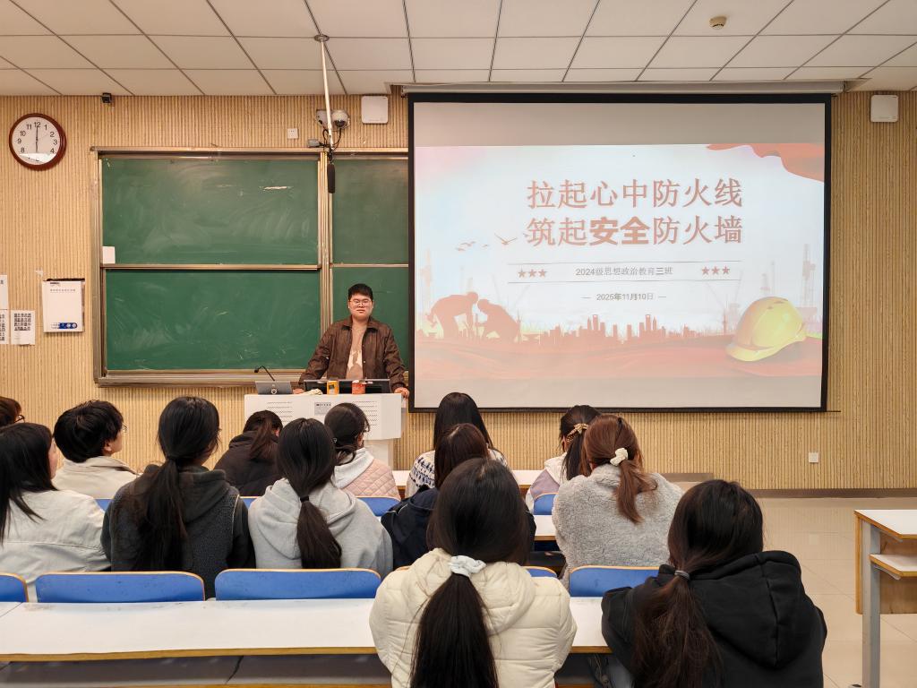 为增强同学们的消防安全意识,提升火灾应急处置和自救互救能力,必赢76net线路官网2024级思想政治教育三班于11月10日在社科楼515教室成功举办“拉起心中防火线,构筑防火安全墙”主题班会。本次活动由班长杨迎滨主持,全体同学积极参与。