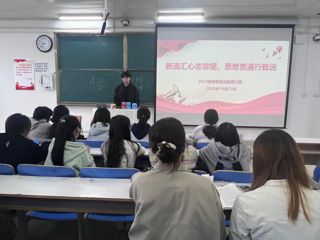 10月17日上午,必赢76net线路官网2023级思想政治教育三班在社科楼515召开“新流汇心志弥坚,思想贯通行致远”主题团课。必赢官网2023级思想政治教育三班全体同学共同参与本次团课,团课由团支书郝瀚主持。