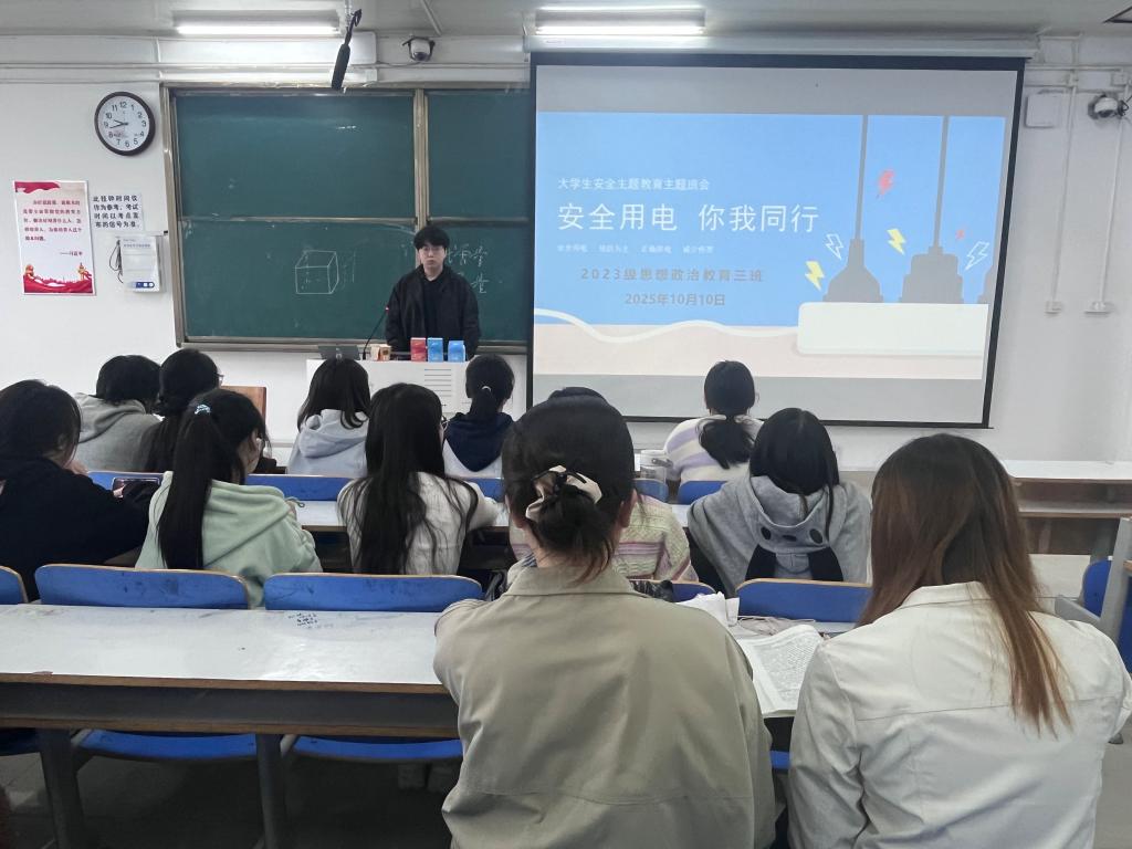 10月10日上午,必赢76net线路官网2023级思想政治教育三班在社科楼515召开“安全用电,你我同行”主题班会。必赢官网2023级思想政治教育三班全体同学共同参与本次班会,班会由团支书郝瀚主持。