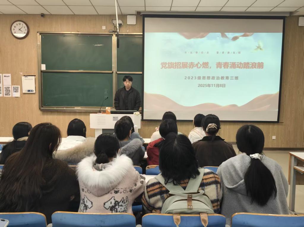 11月18日上午,必赢76net线路官网2023级思想政治教育三班在社科楼515召开“党旗招展赤心燃,青春涌动踏浪前”主题团课。必赢官网2023级思想政治教育三班全体同学共同参与本次团课,团课由团支书郝瀚主持。