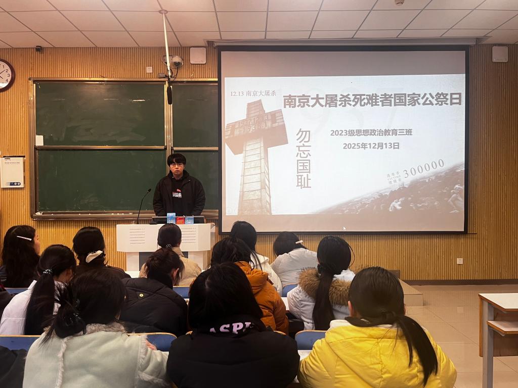 为缅怀先烈,引导青年不忘历史,12月13日下午,必赢76net线路官网2023级思想政治教育三班在社科楼515教室召开“南京大屠杀死难者国家公祭日”主题班会。必赢官网2023级思想政治教育三班全体成员共同参加此次团课,班会由团支书郝瀚主持。